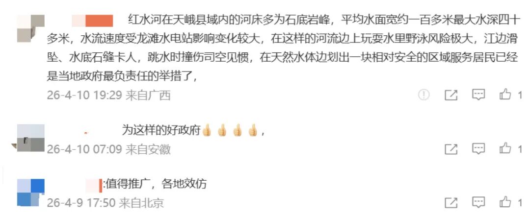 有网友评论称,这样的设置既利用了天然水域,也方便周边居民戏水,还有网友表示,这类做法“既安全又实用”,建议更多地方借鉴。