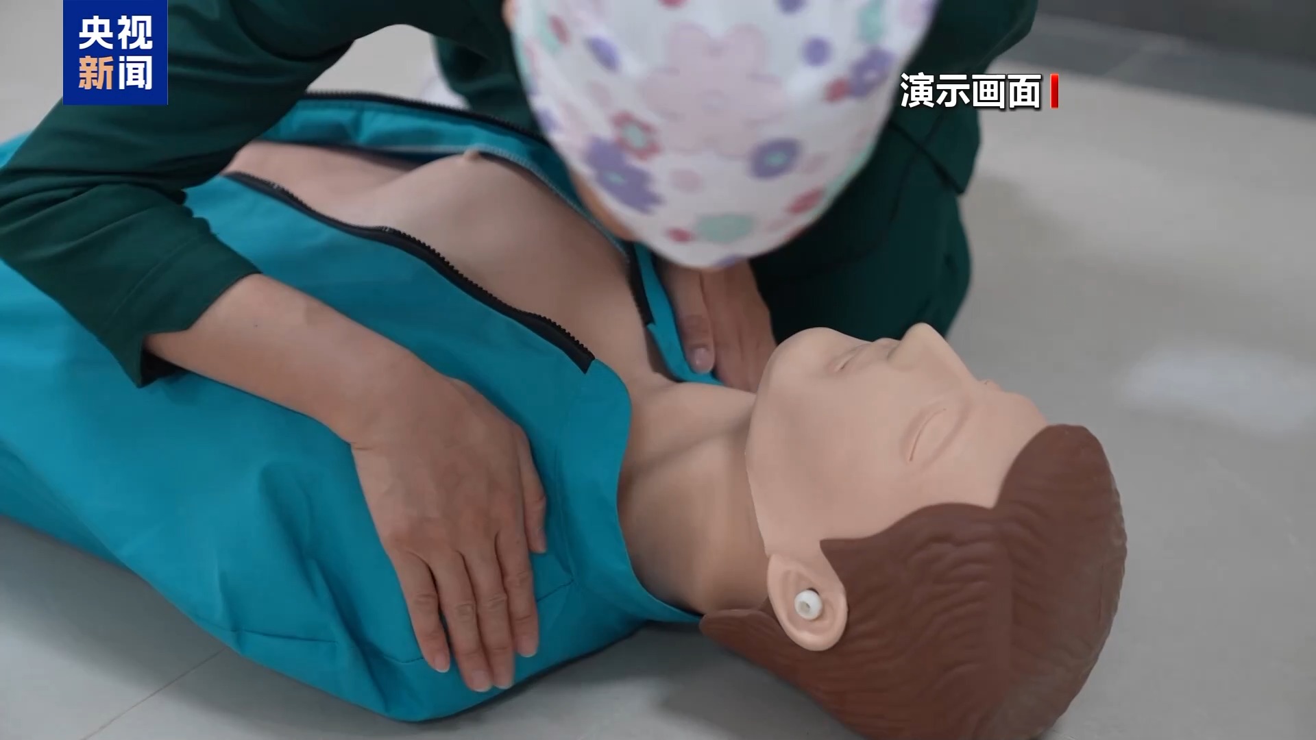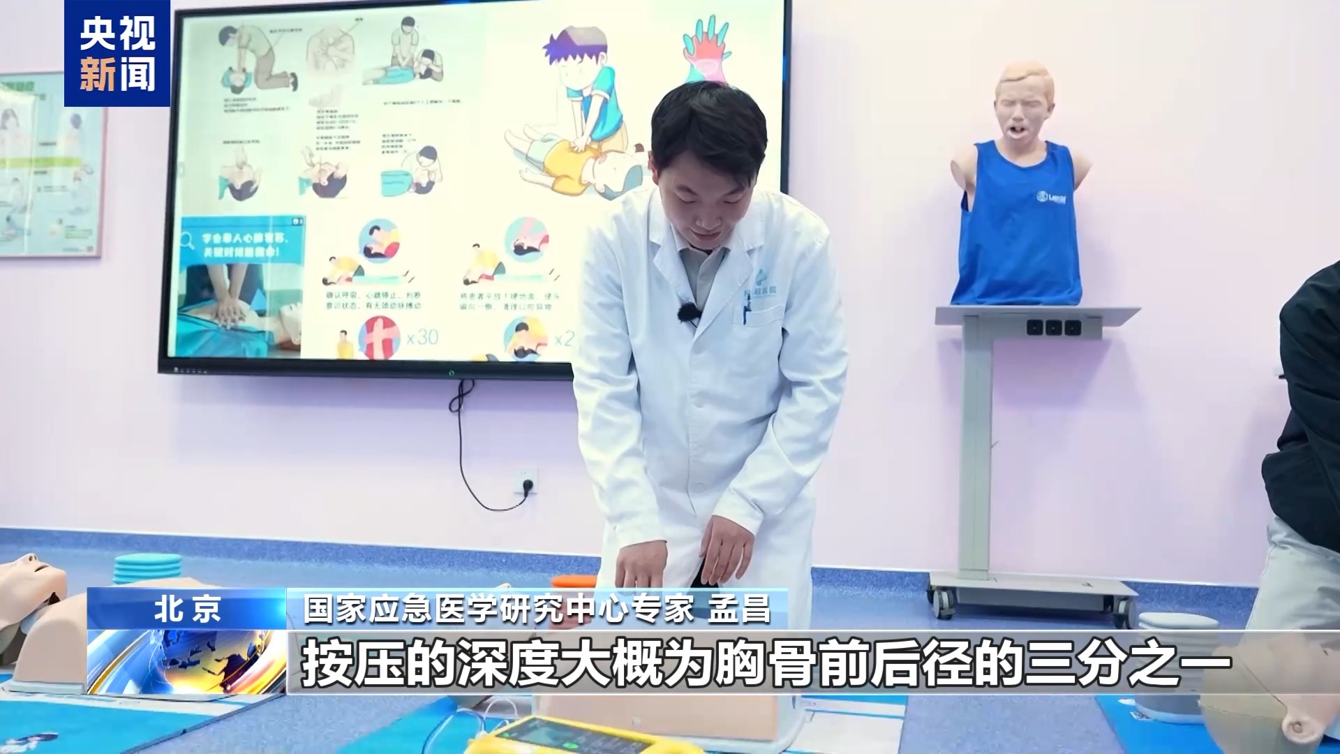 国家应急医学研究中心专家 孟昌:心肺复苏定位在两乳头连线的中点,在胸骨的下半部分。按压的深度大概为胸骨前后径的三分之一,对于成人而言大概5到6厘米,按压的频率大概每分钟100到120次,每秒钟大概两次。按压的手法是双手交叉,用掌根部对准着力点,用力向下按压,按压过程中保持手臂伸直。