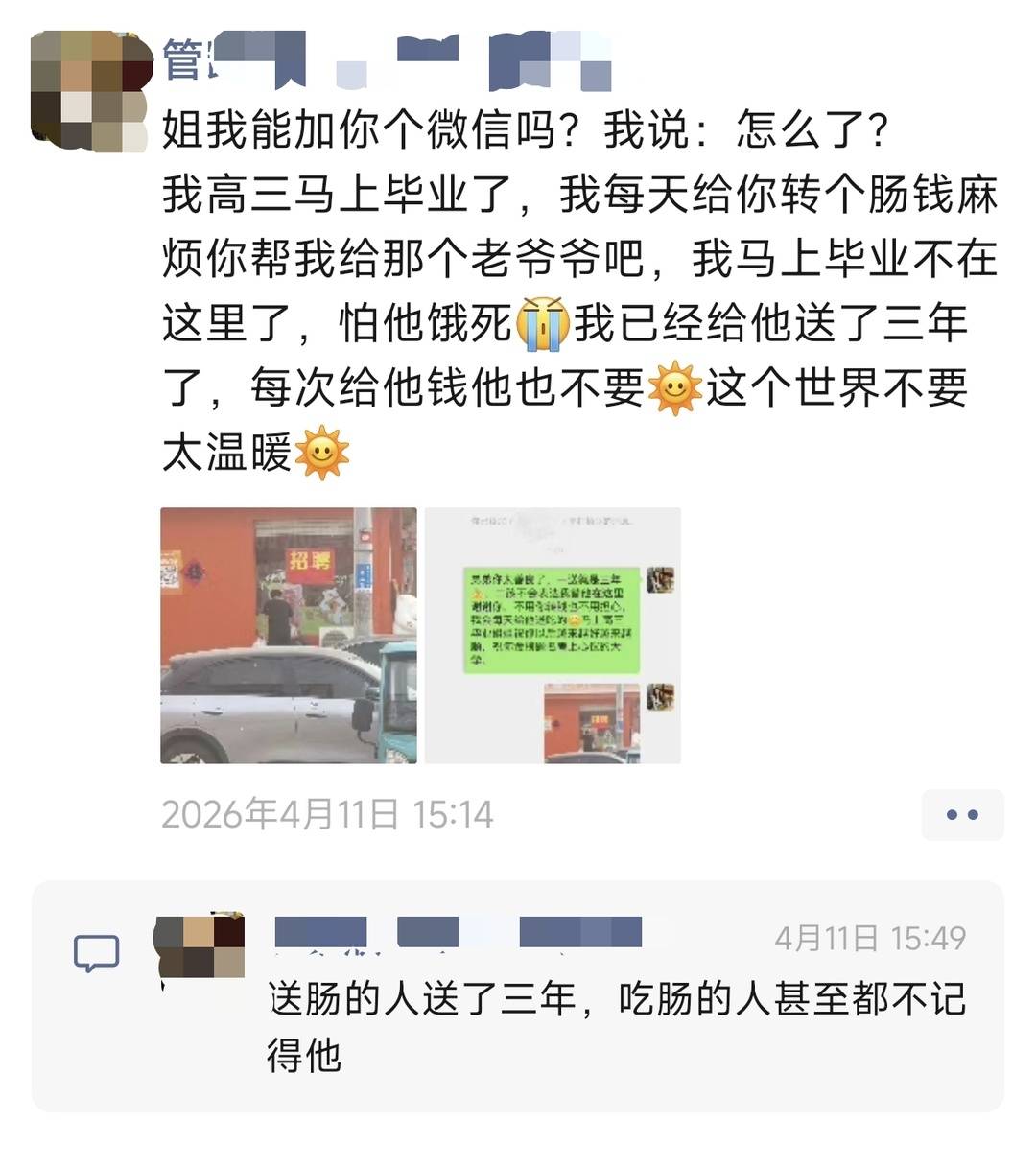 直到管女士把这段对话发到社交媒体平台,人们才知道,给老人送吃的这件事,这个高三男孩,已经默默坚持了三年。
