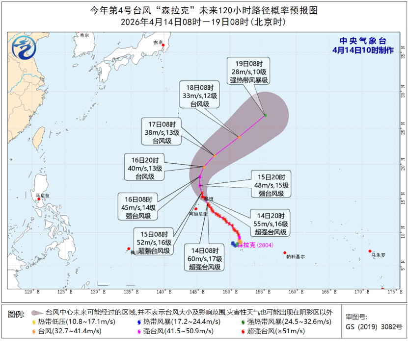 今年第4号台风“森拉克”(超强台风级)的中心今天(14日)上午8点钟位于美国关岛东偏北方向约215公里的西北太平洋洋面上,就是北纬14.2度、东经146.6度,中心附近最大风力有17级(60米/秒),中心最低气压为920百帕,七级风圈半径为450-500公里,十级风圈半径为120-160公里,十二级风圈半径为80公里。