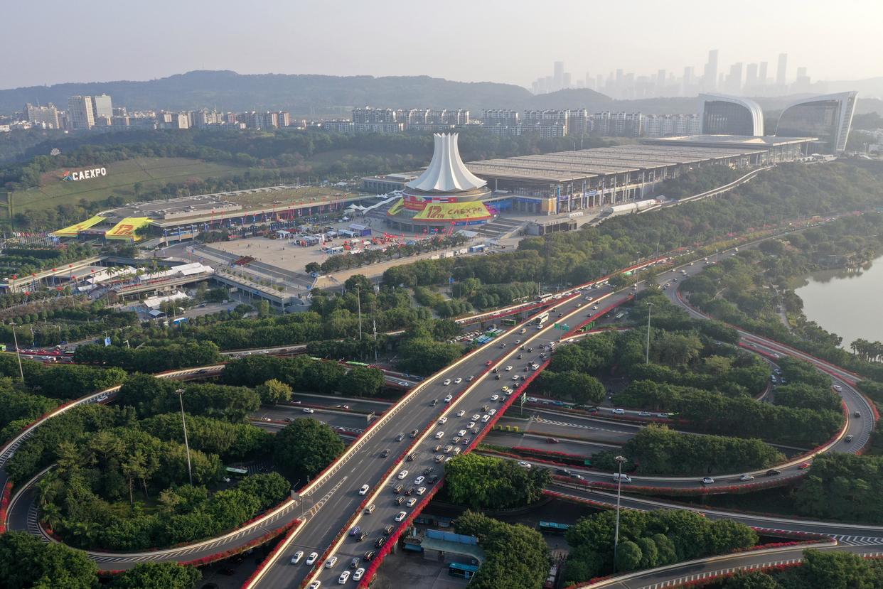 这是绿树红花掩映中的南宁国际会展中心及周边建筑(无人机照片,2020年11月26日摄)。