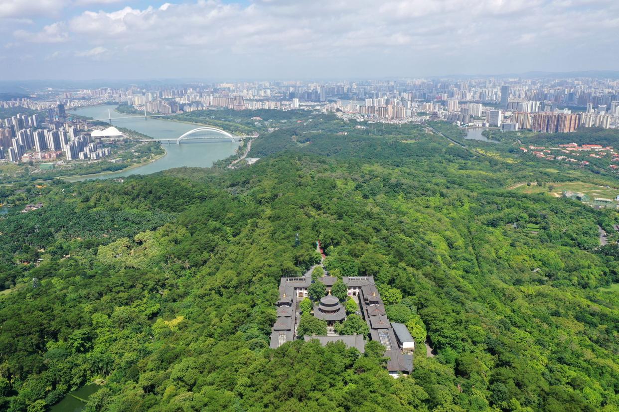 这是南宁市青秀山、邕江及周边建筑群组成的“半城绿树半城楼”城市景观(无人机照片,2021年7月14日摄)。