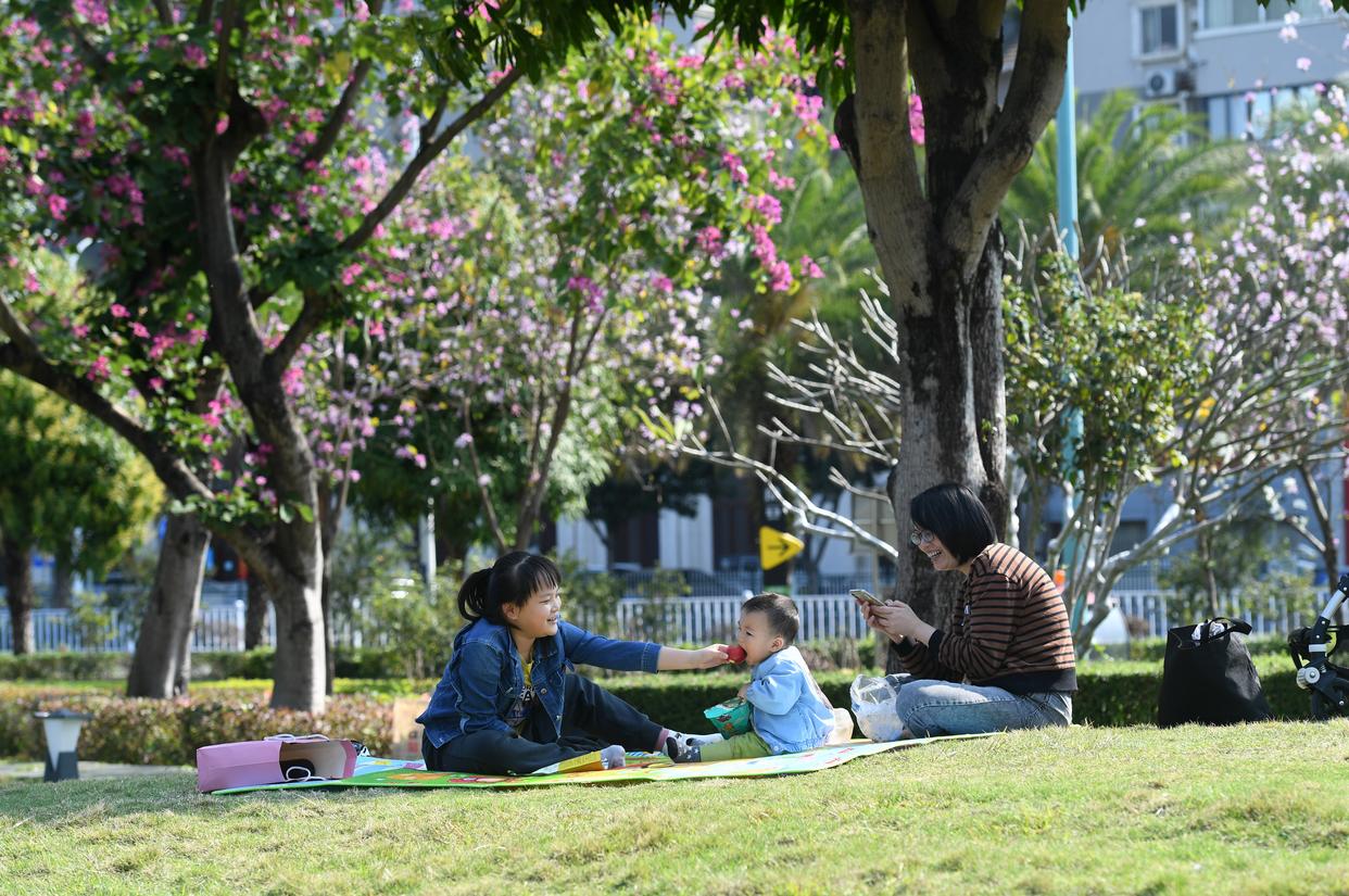 市民在南宁市南湖边绿地上享受阳光(2021年2月17日摄)。