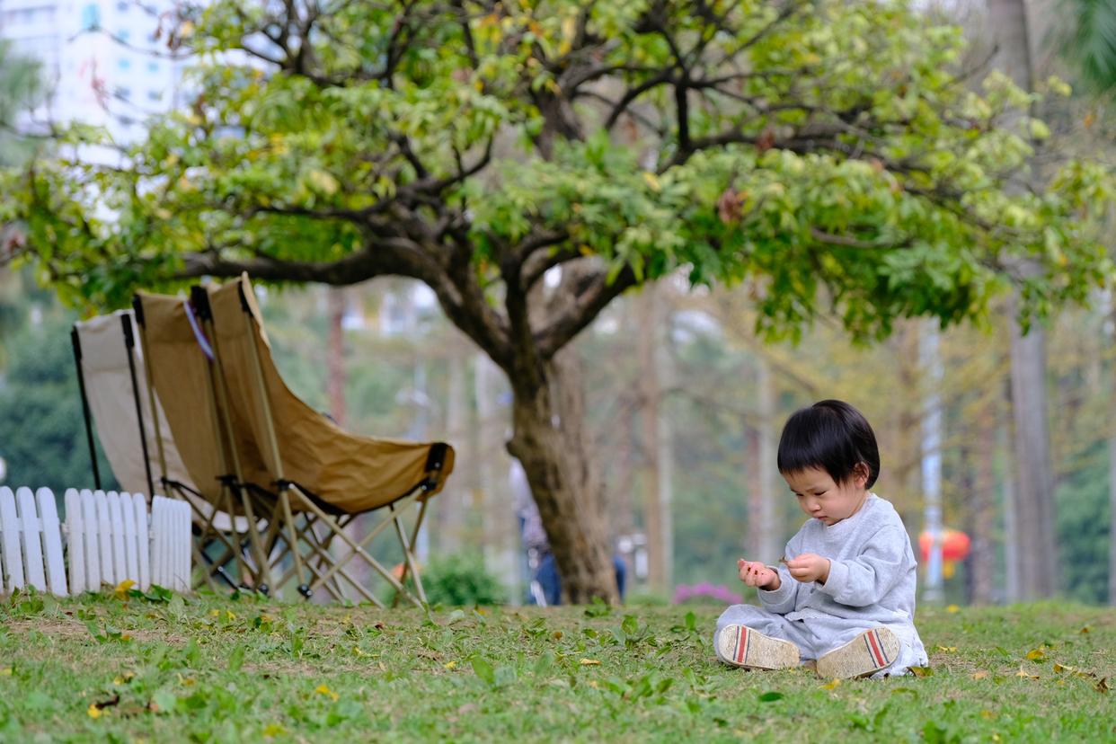 一名小朋友在南宁市南湖边绿地上玩耍(2026年2月23日摄)。
