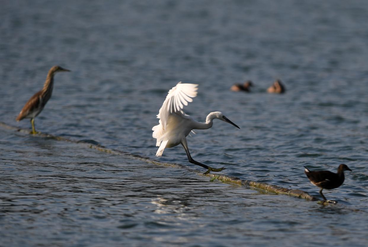 鸟儿在南宁市南湖上嬉戏(2021年10月11日摄)。