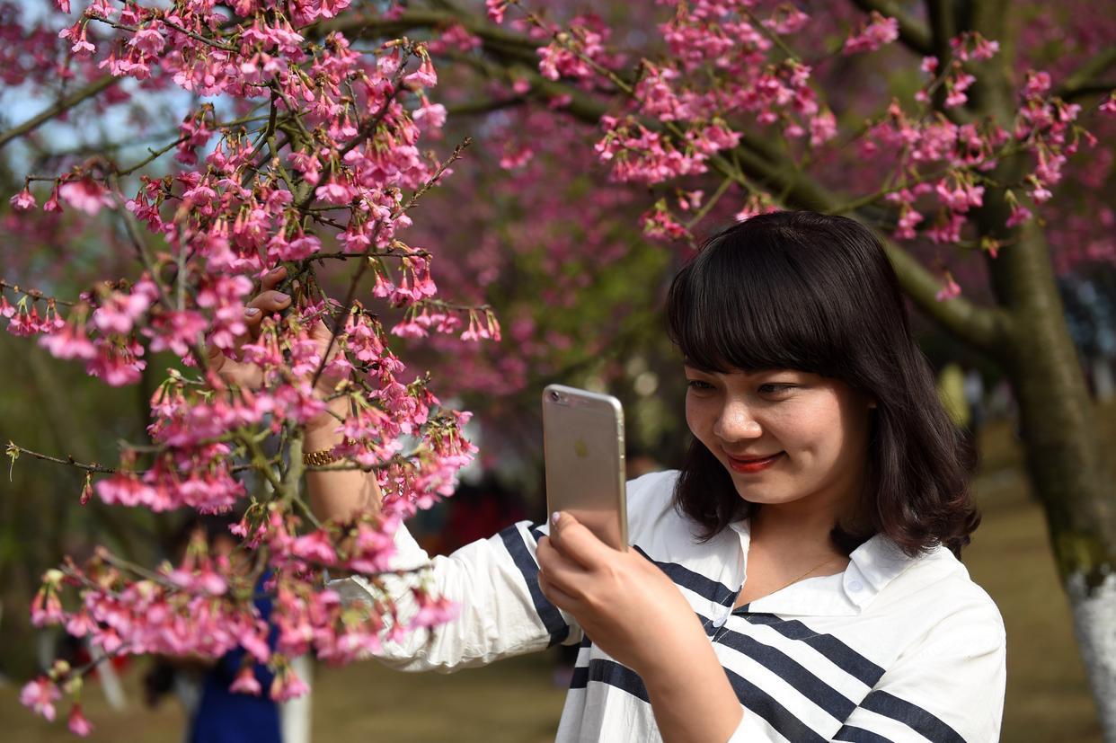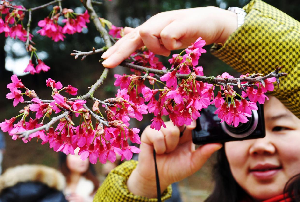 一名游客在南宁市石门森林公园欣赏樱花拍照留念(2012年2月26日摄)。满城四季皆芳菲