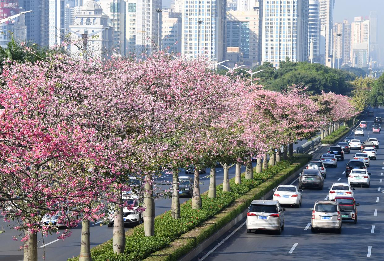 在南宁市民族大道,车辆在红花绿树间行驶(2021年12月7日摄)。春季