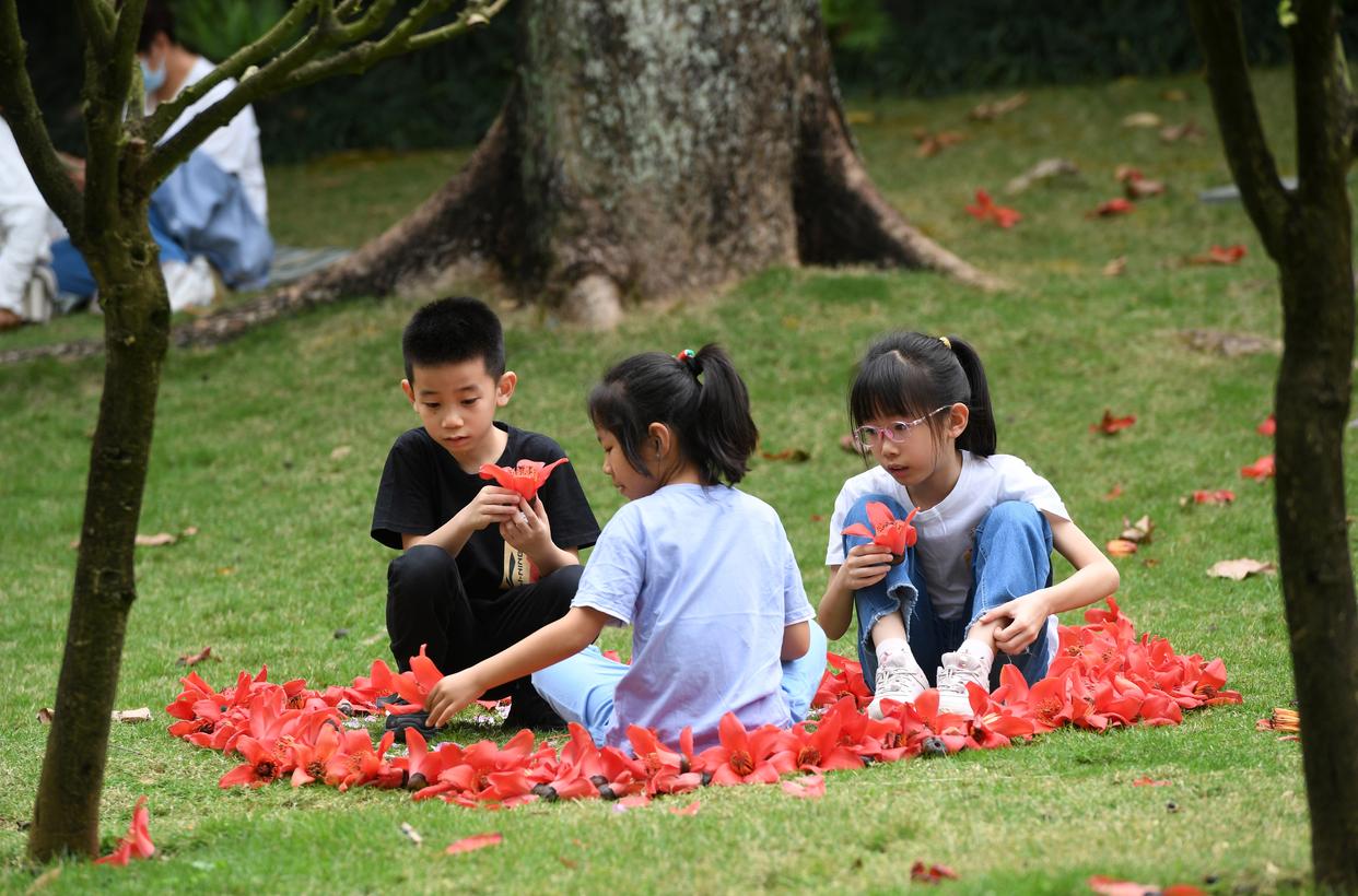 在南宁市金花茶公园,几名小朋友在捡拾掉落的木棉花摆放玩耍(2022年3月20日摄)。