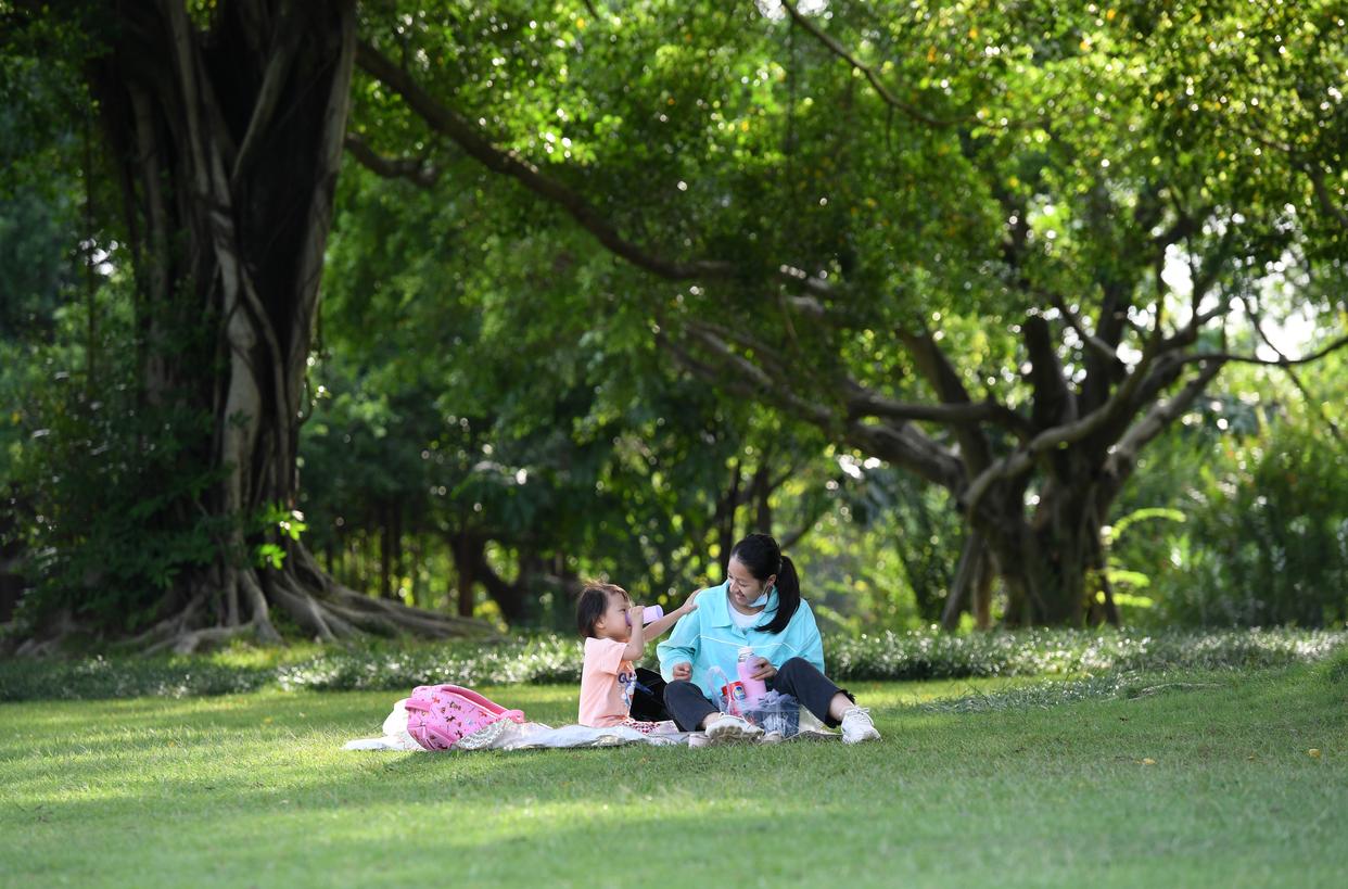 市民在南宁市南湖边榕树荫里休闲(2021年10月12日摄)。