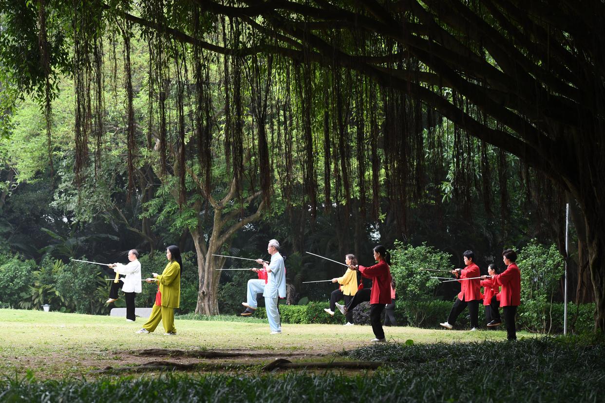 市民在南宁市南湖边的榕树下健身(2022年4月21日摄)。“人间四月天”全年不打烊