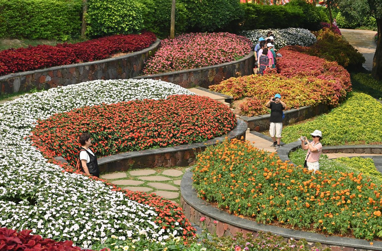 人们在南宁市青秀山欣赏盛开的鲜花(2026年4月12日摄)。由于地处祖国南疆