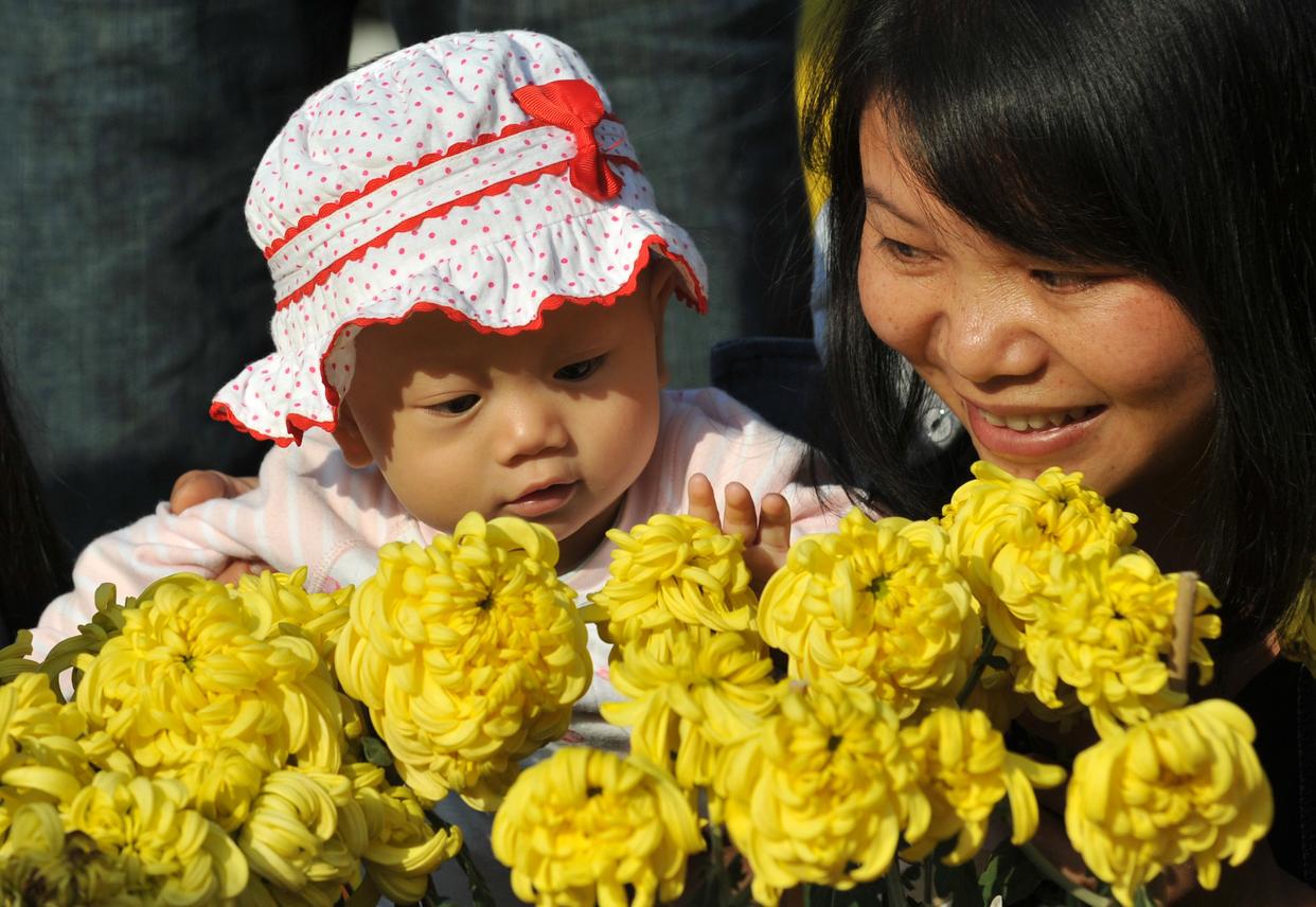 一名市民带着小孩在南宁市南湖广场欣赏菊花(2012年11月18日摄)。