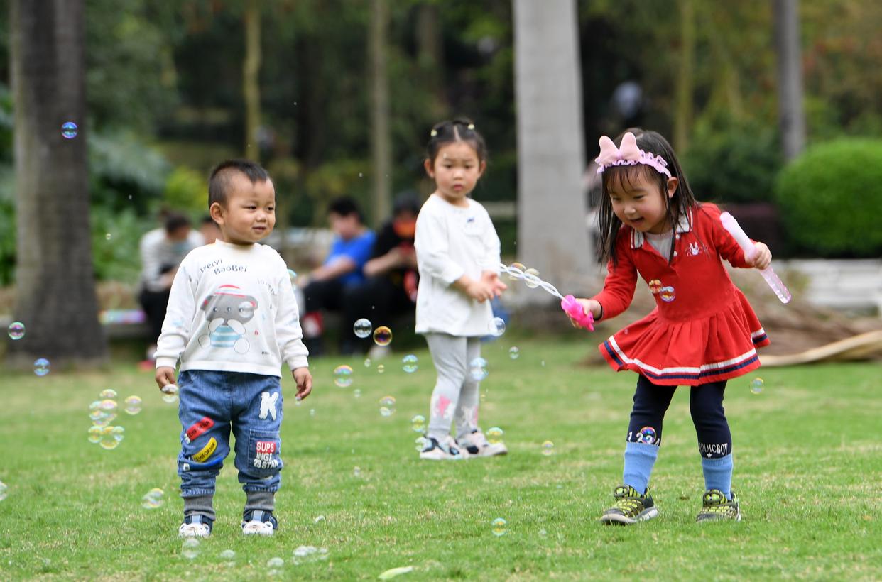 小朋友在南宁市金花茶公园玩耍(2022年3月20日摄)。