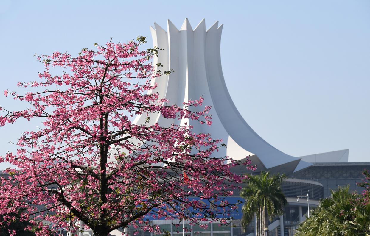 这是掩映在红花绿叶中的南宁国际会展中心(2021年12月7日摄)。