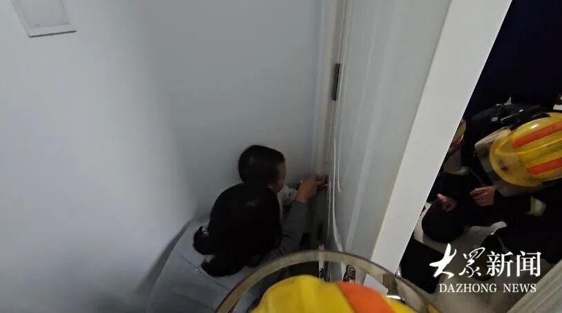 现场消防救援人员一边安抚孩子情绪,一边观察情况,并安排一名消防救援人员稳住门体,防止门体移动对孩子的手带来二次伤害,另一名消防救援人员利用两根撬棍对门缝进行扩张。