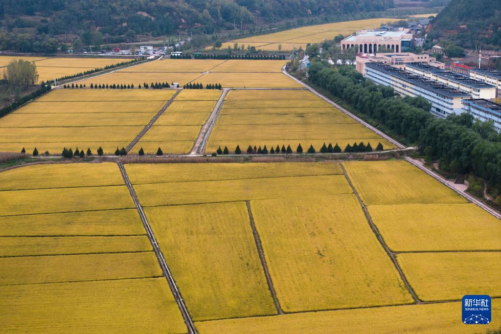 这是2025年10月16日拍摄的南泥湾稻田景色(无人机照片)。新华社记者 邵瑞 摄