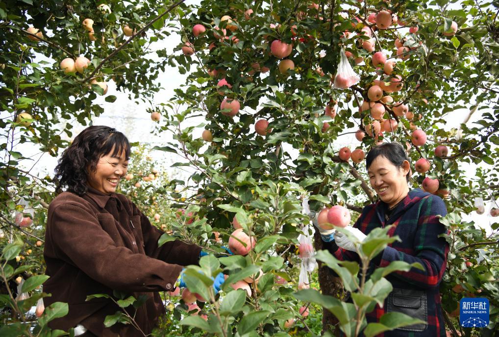 2025年10月17日,果农在延安市宝塔区桥沟街道烟洞沟村采收苹果。新华社记者 张博文 摄