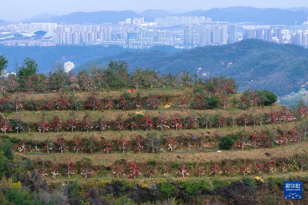 这是延安市宝塔区桥沟街道烟洞沟村苹果园景色(2025年10月17日摄,无人机照片)。新华社记者 邵瑞 摄
