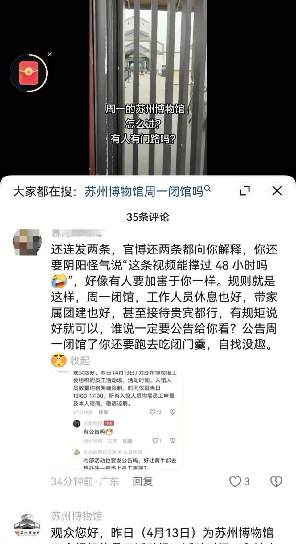 4月14日,在这位网友发布的视频评论区,苏州博物馆官方账号回复称:观众您好,昨日(4月13日)为苏州博物馆工会组织的员工活动场,活动时间、入馆人员数量均有明确限制,时间仅限当日13:00-17:00,所有入馆人员均需员工申报及本人陪同,敬请谅解。