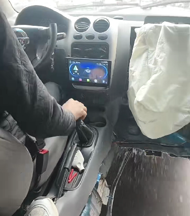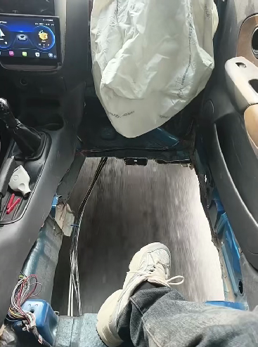 记者从视频画面中看到,视频拍摄者坐在一辆机动车的右侧位置,该车副驾驶位置缺少底盘,能看见路面,并且安全气囊已经弹出,而驾驶员正操纵着只有一半的方向盘。