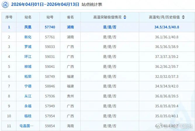 据中央气象台统计,4月1日以来,华南西部及贵州南部、湖南南部等地气温较常年同期显著偏高,海南屯昌(4月10日最高气温40.4℃)、广西环江(4月10日最高气温37.3℃)等国家气象观测站最高气温突破当月历史极值。受高温少雨天气影响,海南、广西、广东西部等地出现中到重度气象干旱,森林火险气象等级较高。