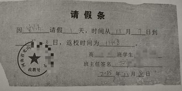 根据盖着所在学校印章的《请假条》显示,因生病请假一天,从11月7日至11月8日,学生周雨。班主任签名“刘某”。