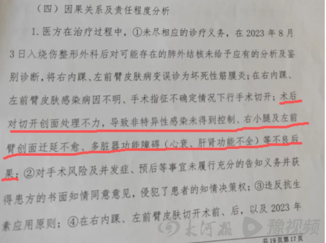 2025年2月,第三份医疗事故鉴定报告明确,医方对病情存在误诊;感染病因、手术指征不确定情况下进行手术;术后对创面处理不力,导致感染失控、多脏器功能障碍(心衰、肝肾功能不全)等;对手术风险等未履行告知,侵犯患者知情决策权;违反抗生素应用原则;确诊皮肤结核后,未见对患者抗结核治疗,违反皮肤结核治疗规范;违反人血蛋白使用规范,对患者治疗期间的容量管理、疾病治疗和预后均存在影响;对患者容量管理、营养支撑、泛血管病等诊治能力不足,加重患者多脏器功能障碍。