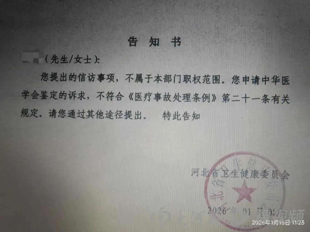 2026年1月,家属通过河北省卫生健康委(以下简称河北卫健委)提出诉求,希望申请中华医学会进行鉴定。河北卫健委回复称,其信访事项不属于该部门职权范围,不符合相关规定,要求家属通过其他途径提出。