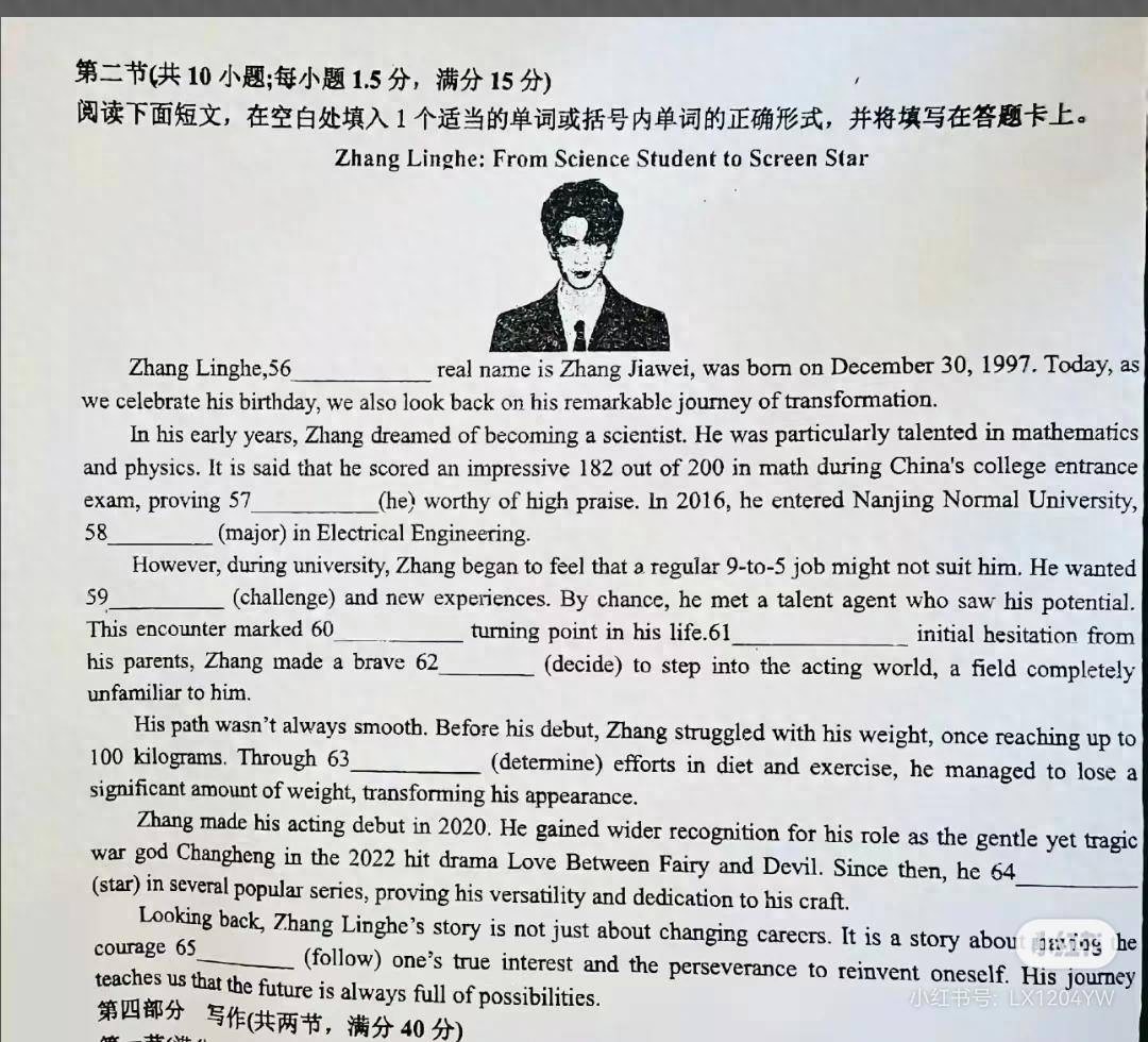 《逐玉》虽落幕,但由该剧引发的张凌赫相关考古热潮还在继续。记者注意到,与张凌赫相关的英语阅读理解截图在社交平台流传,其个人经历与主演剧集,成为英文阅读热门素材。其中一篇阅读以张凌赫的真实人生为蓝本,详细介绍了他从江苏无锡走出,就读于南京师范大学电气工程专业的学霸过往,以及被经纪人发掘后跨界演戏、从零打磨演技的逐梦故事。另一篇高三阅读则围绕其主演的都市医疗爱情剧《爱你》展开,聚焦剧中他饰演的中医师何苏叶。文本介绍了剧集以中医诊疗为线索,讲述温柔医者与失眠患者相互治愈的剧情,还提及张凌赫为角色学习针灸、脉诊等中医疗法的幕后准备,以及剧集融入中草药命名、中医临床应用等文化细节。有网友表示,“这是一篇张凌赫的专访报道,被合肥二模英语拿来做考题了。”还有与《逐玉》东南亚传播的初一时文阅读。