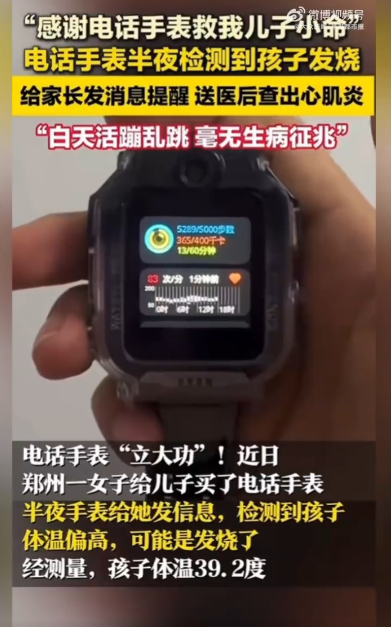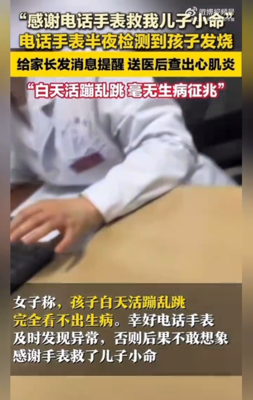 女子称,孩子白天活蹦乱跳,完全看不出生病。幸好电话手表及时发现异常,否则后果不敢想象,感谢手表救了儿子小命。