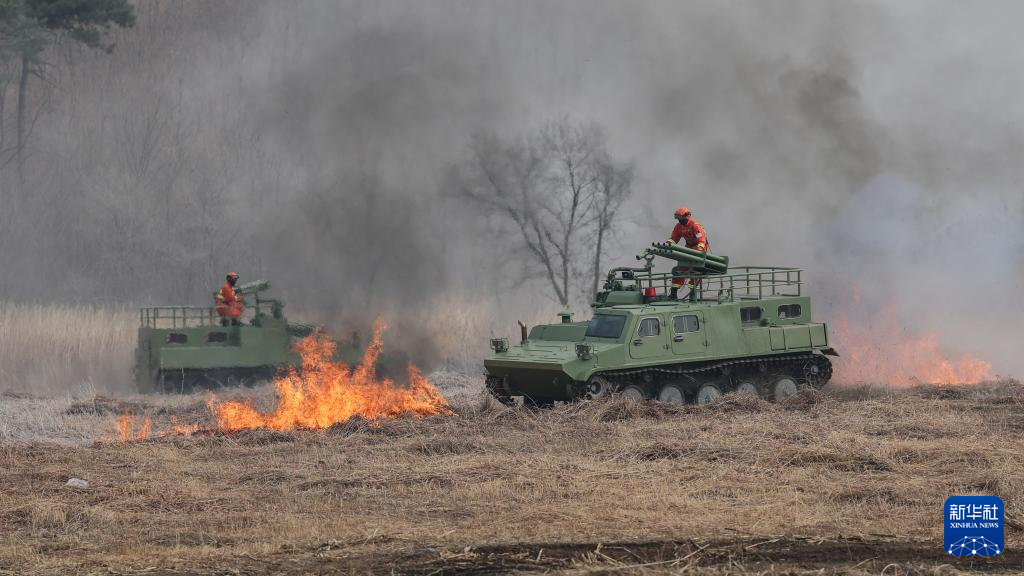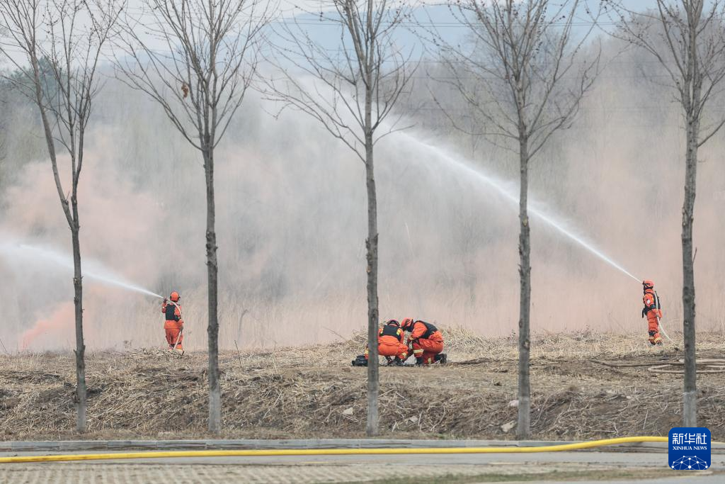 4月14日,森林消防人员在演练现场进行灭火演练。
