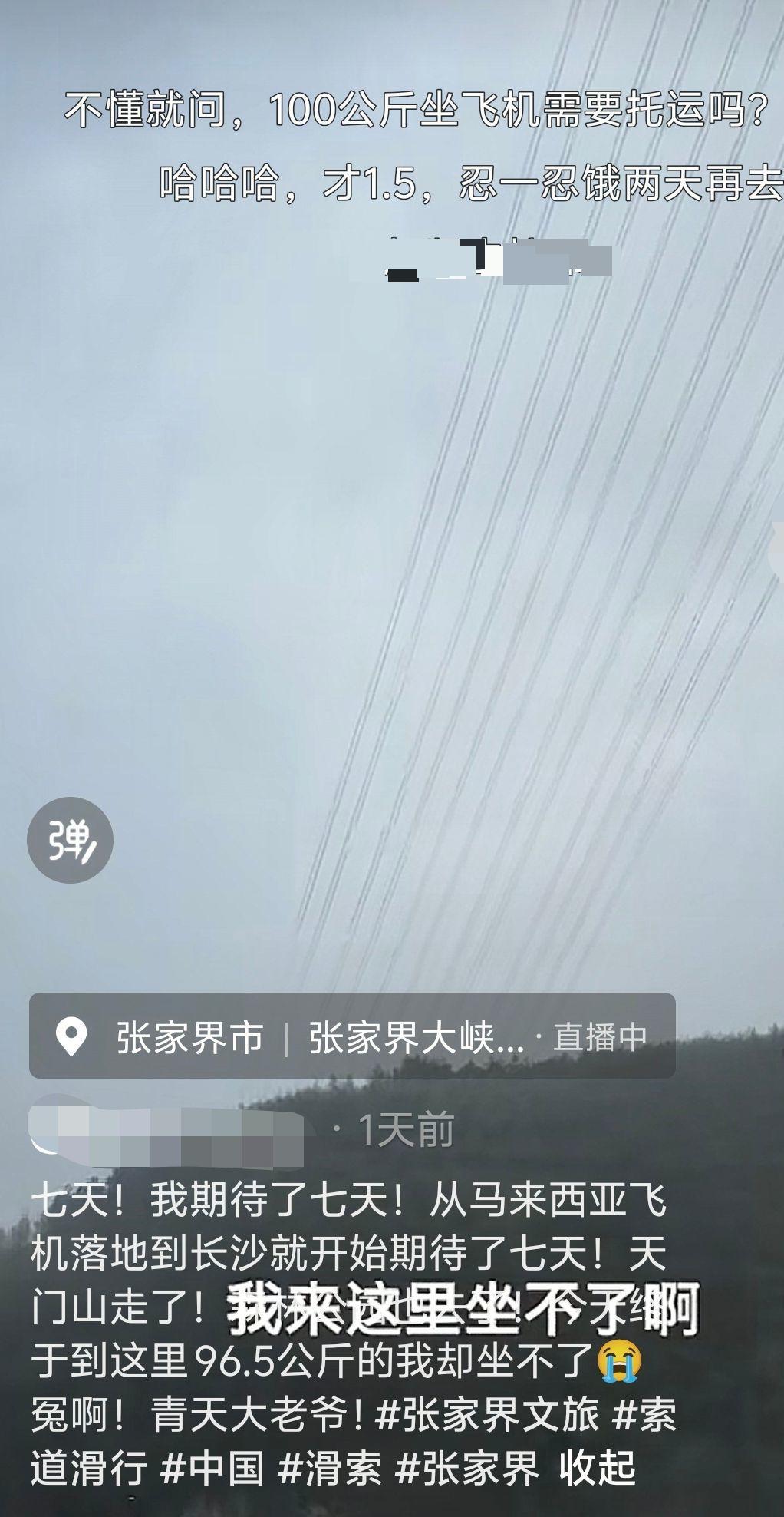 “能不能提升至100公斤啊?我来这里坐不了啊。”游客一边拍摄滑索画面一边大喊道。4月14日,该游客发布视频时配文写道:“七天,我期待了七天,从马来西亚飞机落地到长沙就开始期待了,天门山走了,森林公园也去了,今天终于到这里,96.5公斤的我却坐不了。”