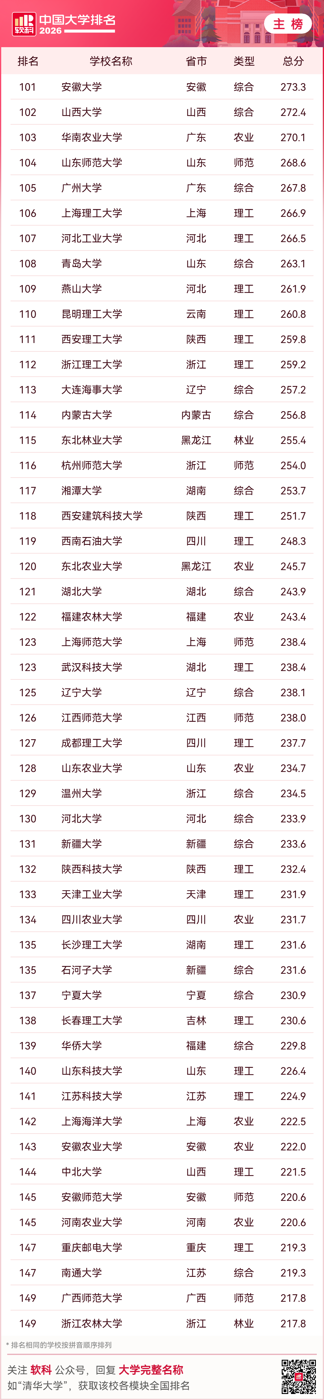 2026年4月15日,高等教育专业评价机构软科今日正式发布“2026软科中国大学排名”。清华大学、北京大学、浙江大学雄踞主榜(即综合性大学排名)前三位。 河南两所高校进入排行榜前100,其中,郑州大学排名44、河南大学排名95。 北京协和医学院蝉联医药类大学排名榜首,北京中医药大学摘得中医药大学排名桂冠,上海财经大学位列财经类大学排名之首,北京外国语大学占据语言类大学排名第一,中国政法大学问鼎政法类大学排名冠军,中央民族大学高居民族类大学排名首位,上海体育大学持续领跑体育类大学排名,香港中文大学(深圳)拔得中国合作办学大学排名头筹。