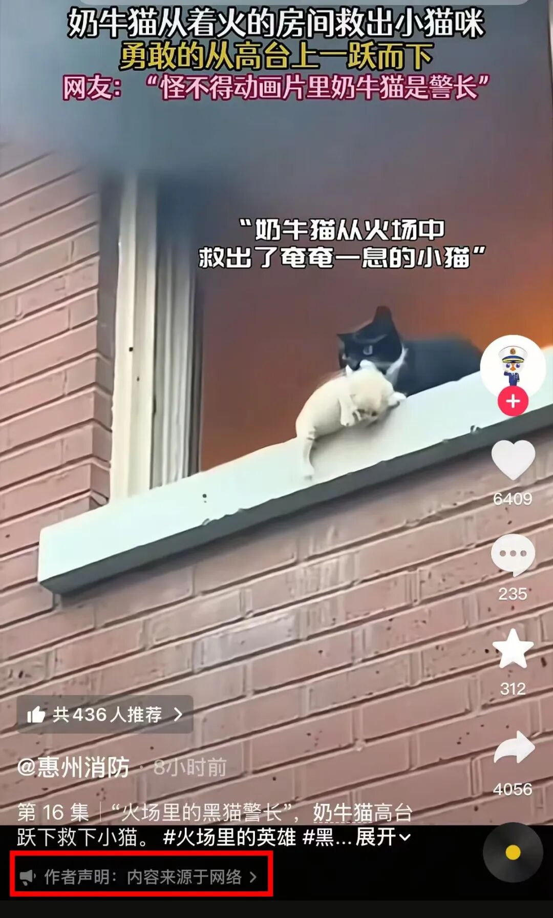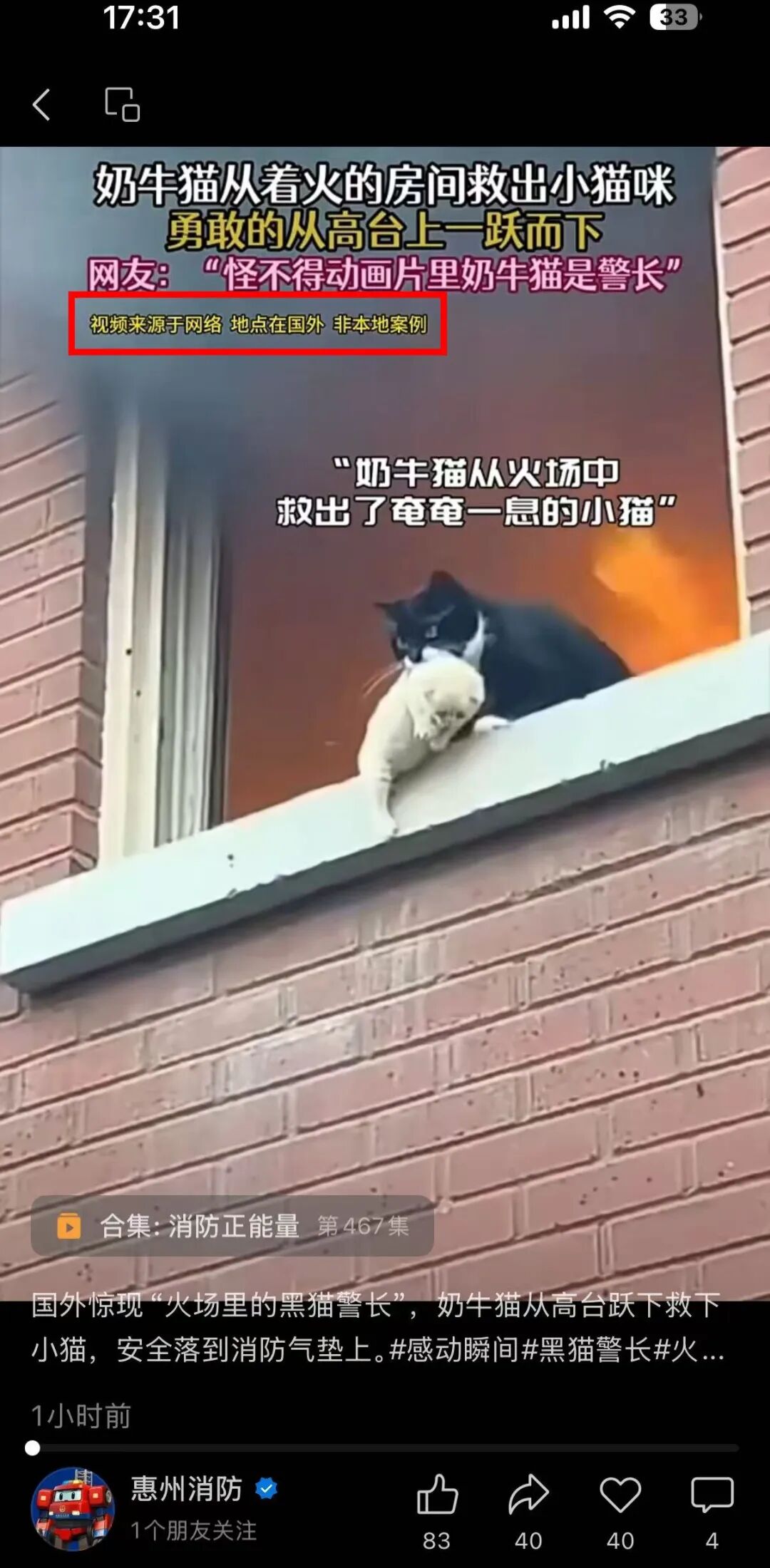 近日,一条视频火爆全网。视频中,一处高楼起火,在起火楼层的窗口,一只奶牛猫叼着一只小白猫从楼上跳下,下方有消防人员拉起布稳稳接住两只猫。奶牛猫被网友称为“火场里的黑猫警长”。该视频被惠州消防、一些媒体转发。小编发现,目前视频已被下架。