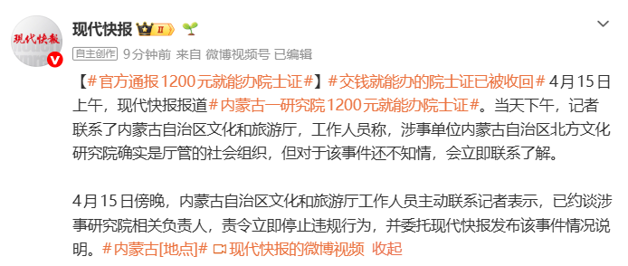 据现代快报,4月15日上午,“内蒙古一研究院1200元就能办院士证”相关话题引发关注,15日晚,官方通报1200元就能办院士证,交钱就能办的院士证已被收回。