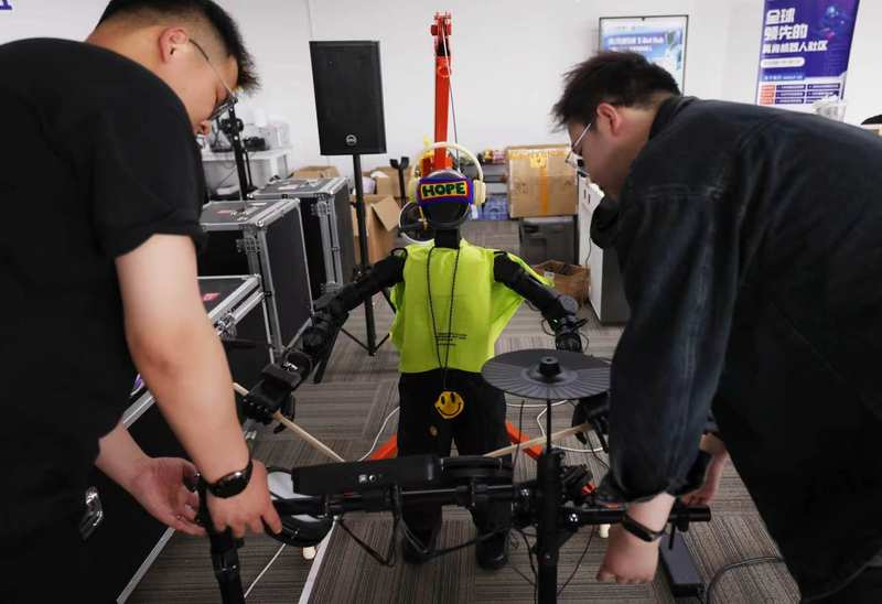 工作人员调试机器人乐手。新京报记者李木易摄