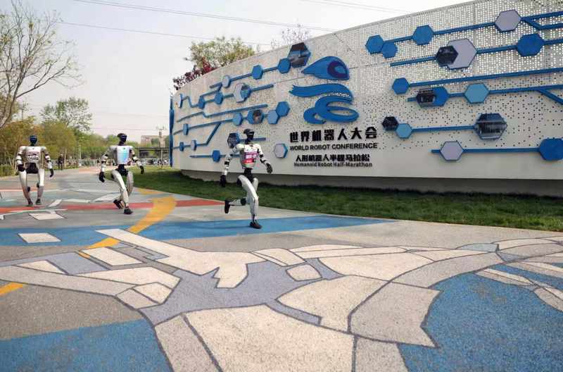 在机器人半马比赛中,除了100多支钢铁“跑者”战队,赛场外,机器人拉拉队、机器人乐队组成的“氛围组”正在进行最后的彩排。