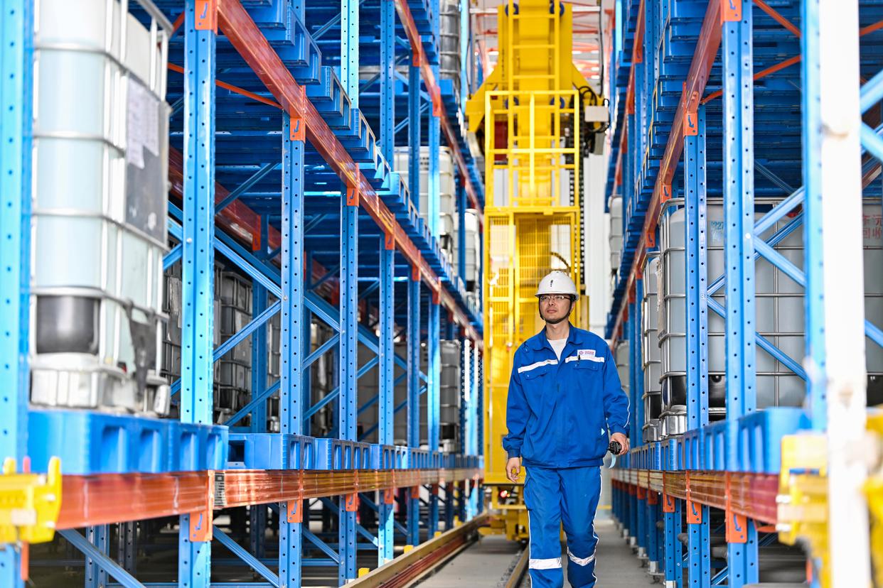 4月15日,在中海油(天津)油田化工有限公司南港化工厂,工作人员在智能库房查看。新华社记者 赵子硕 摄