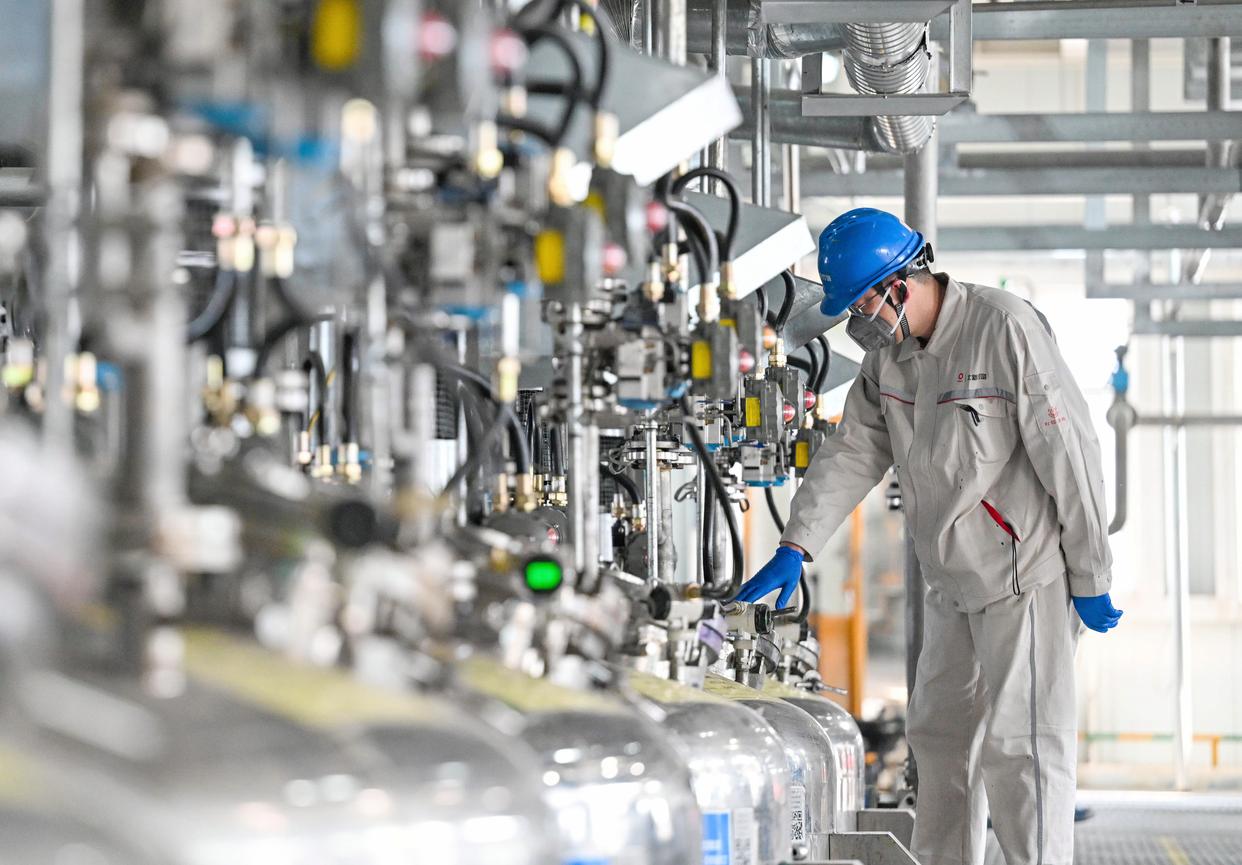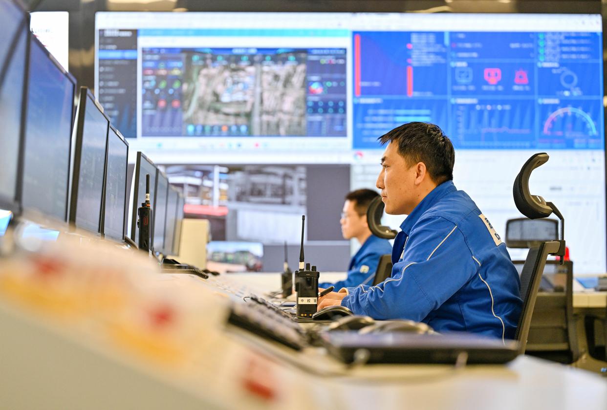 4月15日,在中海油(天津)油田化工有限公司南港化工厂中控室,工作人员监控车间生产情况。新华社记者 赵子硕 摄