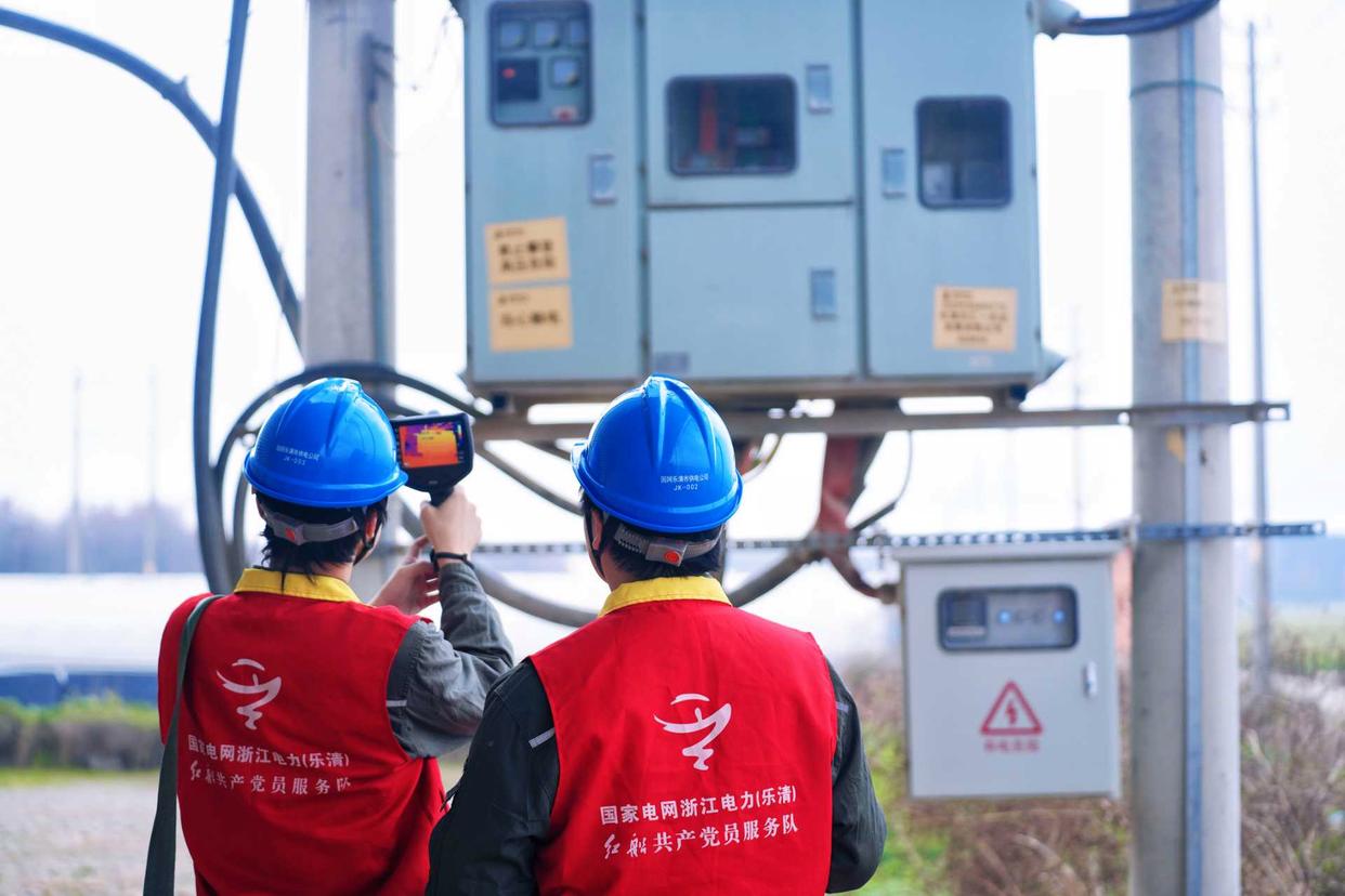 国网温州供电公司共产党员服务队到乐清汇一农事服务中心,对周边供电线路、配电变压器开展安全用电隐患排查。(章静 摄)