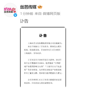 4月16日,@丝芭传媒发布讣告: