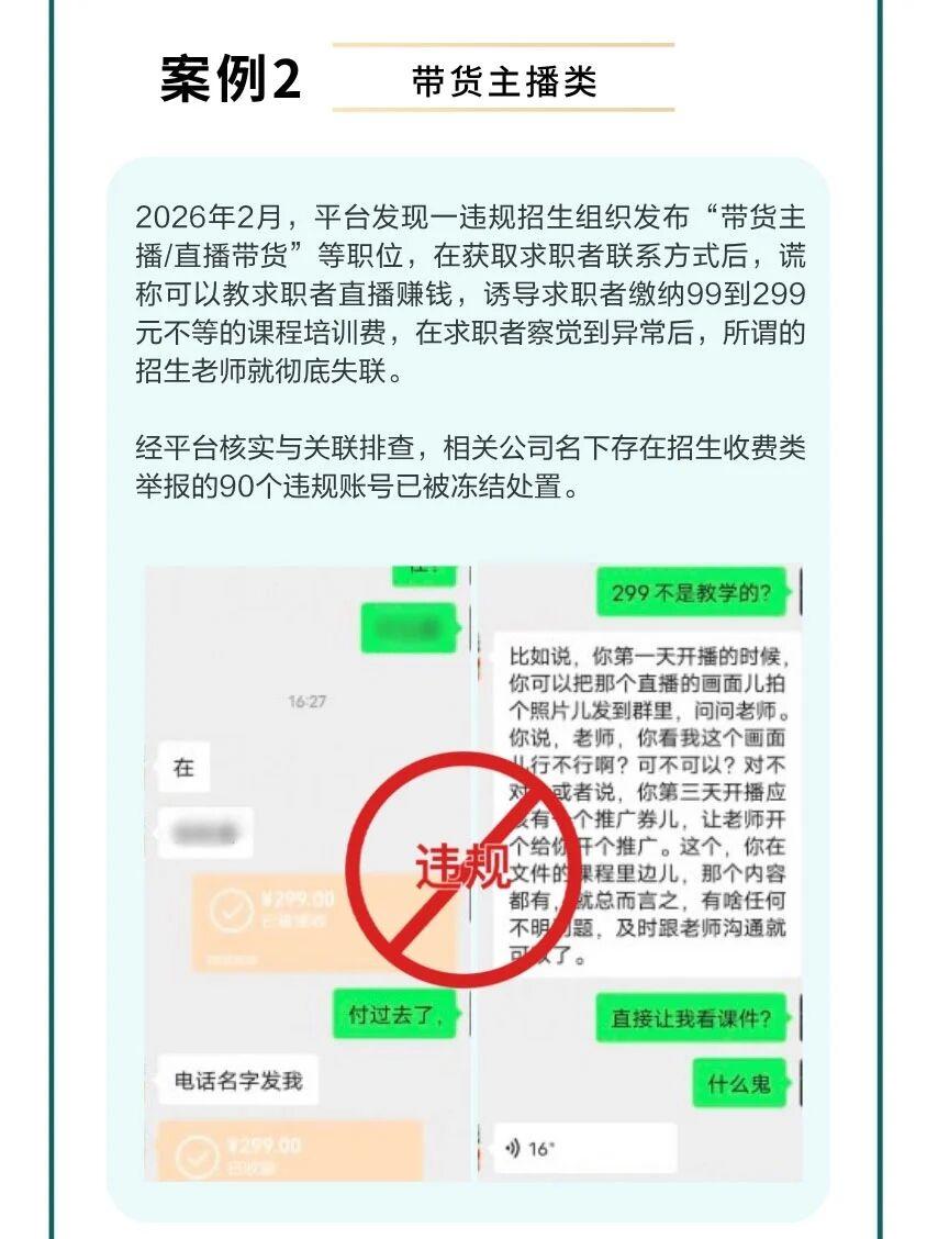 例如公告披露,一违规招生组织发布“带货主播/直播带货”等职位,谎称可以教求职者通过直播赚钱,进而诱导其缴纳99元至299元不等的课程培训费。待求职者察觉异常后,所谓的“招生老师”便彻底失联。