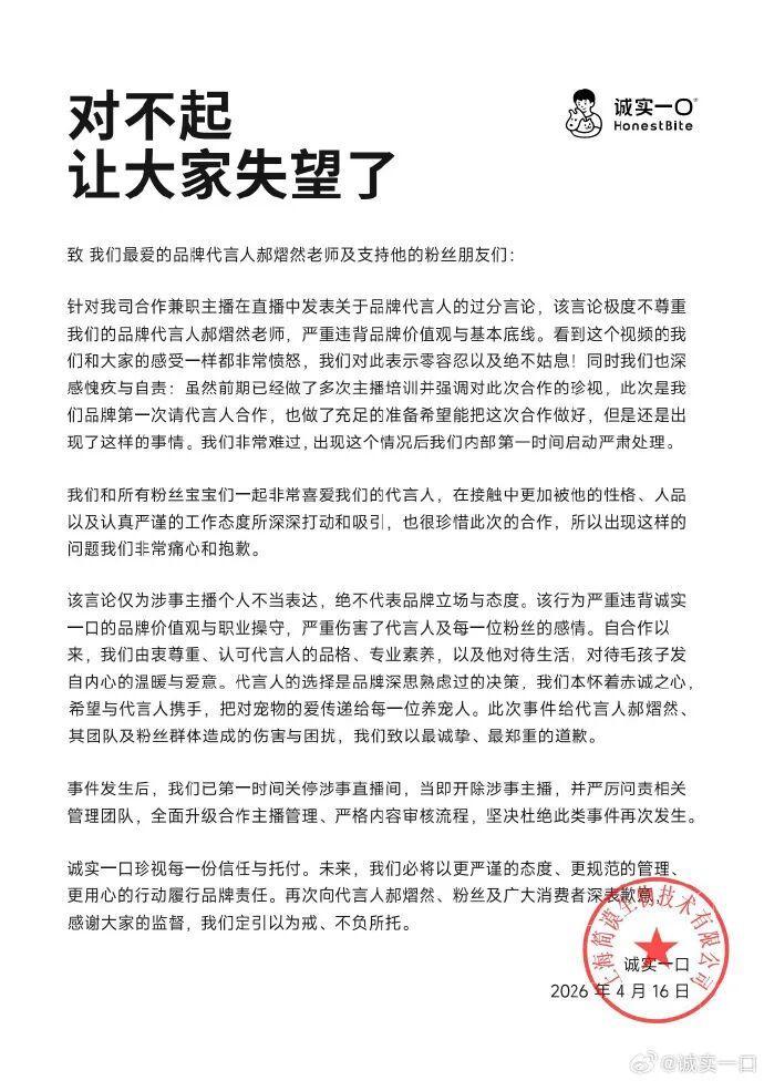 4月16日,宠物食品品牌“诚实一口”官方发文:一份郑重的道歉,对不起,让大家失望了。