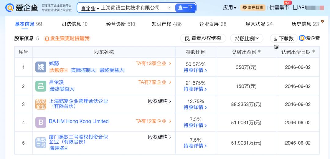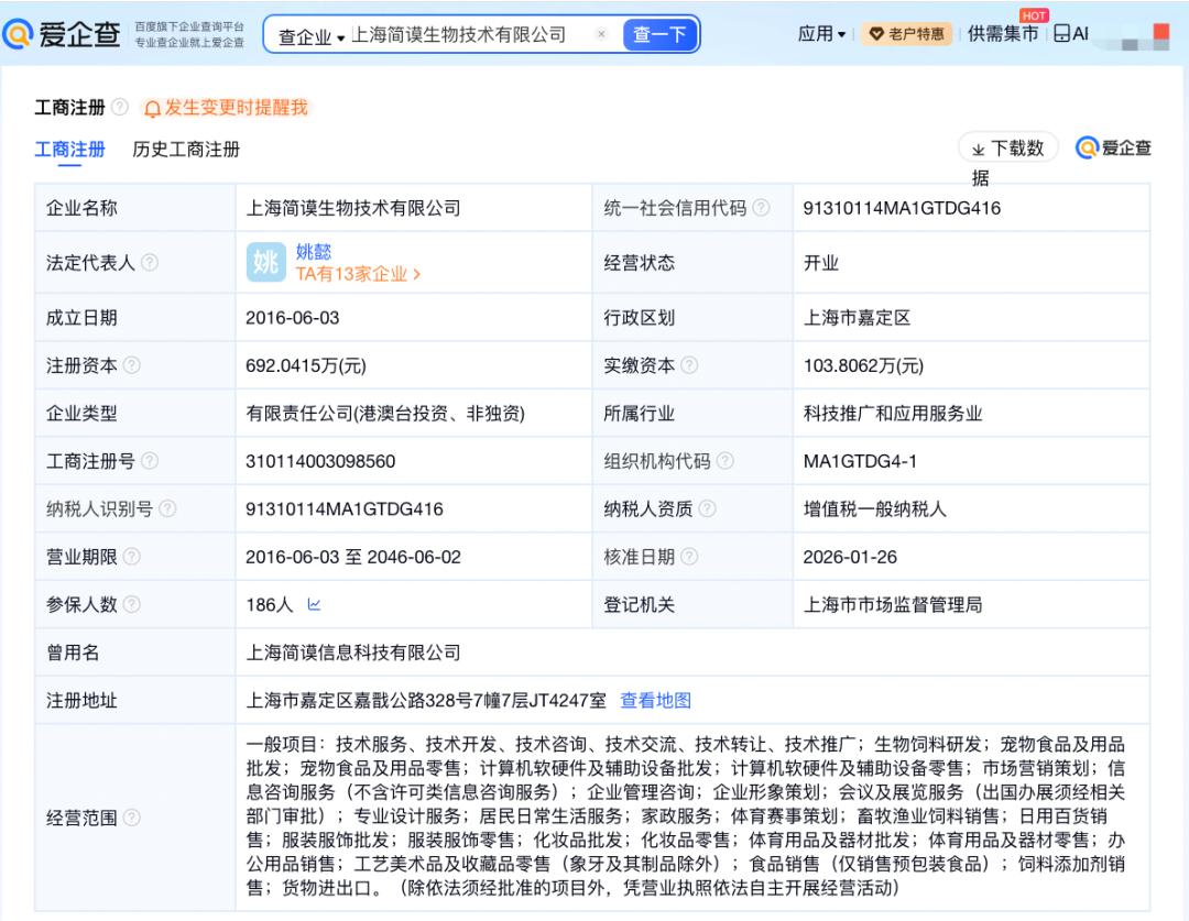 爱企查App显示,诚实一口关联公司上海简谟生物技术有限公司成立于2016年6月,法定代表人为姚懿,注册资本约692万元人民币,经营范围包括生物饲料研发、宠物食品及用品批发、宠物食品及用品零售等,由姚懿、吕依凌等共同持股。