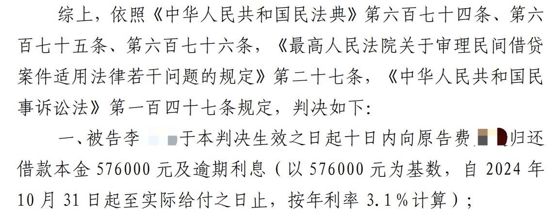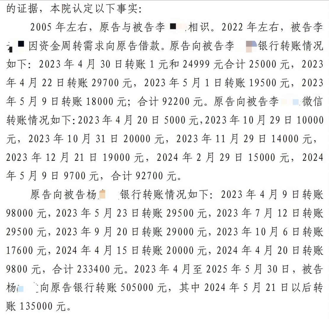 2026年,费先生起诉了李某某及其儿子、前夫。4月7日,南通市崇川区法院一审判决,认定从2022年至2024年,费先生先后通过银行账户、微信,向李某某、前夫杨某某、儿子杨某转账数十次。经法院核算,双方确认李某某还欠费先生57.6万元,判令其限期偿还本金及利息。