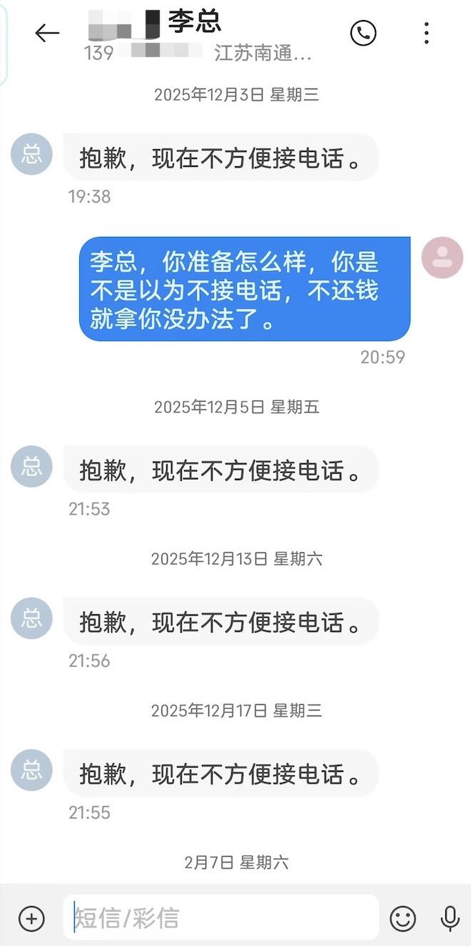 ▲李某某拒接茅先生电话,短信自动回复