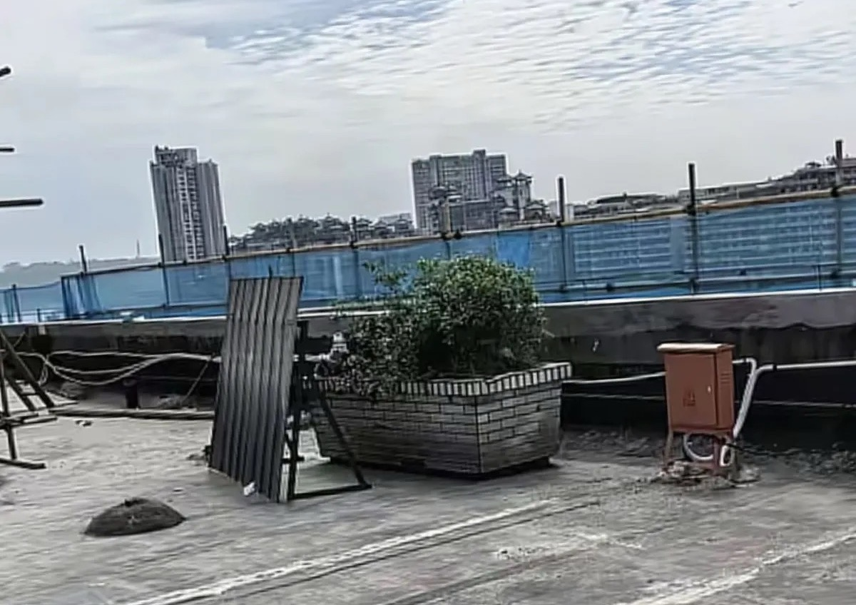 沱江的晨雾还没散尽,早上7点刚过,岸边服装批发商城的天台上,工人已经忙开了。他们敲开入口附近的一座花坛,瓷砖剥落,土块露出来,还保持着花坛的形状。