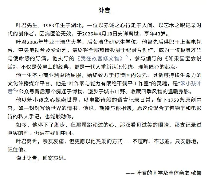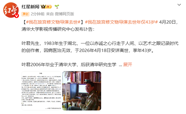 4月20日,多人在社交平台发文悼念《我在故宫修文物》导演叶君。同日,清华大学影视传播研究中心发布讣告: