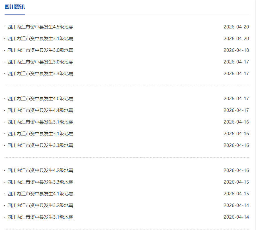 近日,四川省内江市资中县频繁发生地震,引发大众关注。据四川省地震局官网消息,自4月10日起至今,资中县境内发生27起3级以上地震,最大震级为4.5级。