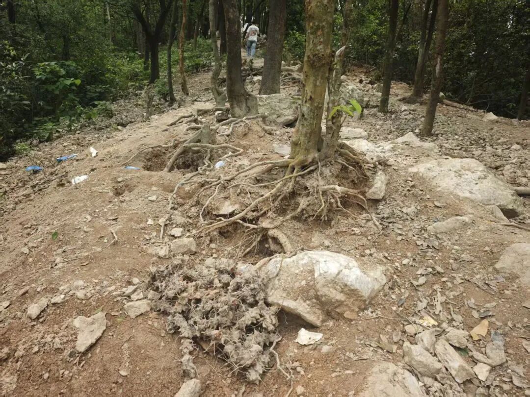 黄埔区林业和园林局核查发现,暹岗大山、长平社区(石碑头山)北二环扩建范围步道两侧因采挖水晶致约8处点位零星林地破坏,导致孔洞处林下地被、杂草被清理,个别树根裸露。目前事发点林木未出现枯死。
